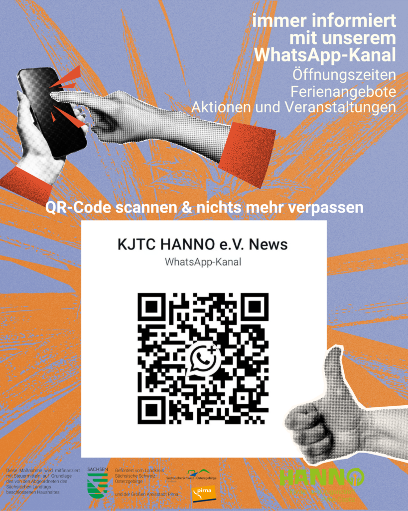 Nicht Alle haben Instagram, oder können die App nur zu bestimmten Zeiten nutzen. Damit Ihr noch einfacher über unsere Öffnungszeiten, Schließtage, Ferienangebote, Aktionen, Veranstaltungen, …. informiert seid und nicht vor verschlossener Tür steht, gibt es jetzt den WhatsApp-Kanal KJTC HANNO e.V. News.